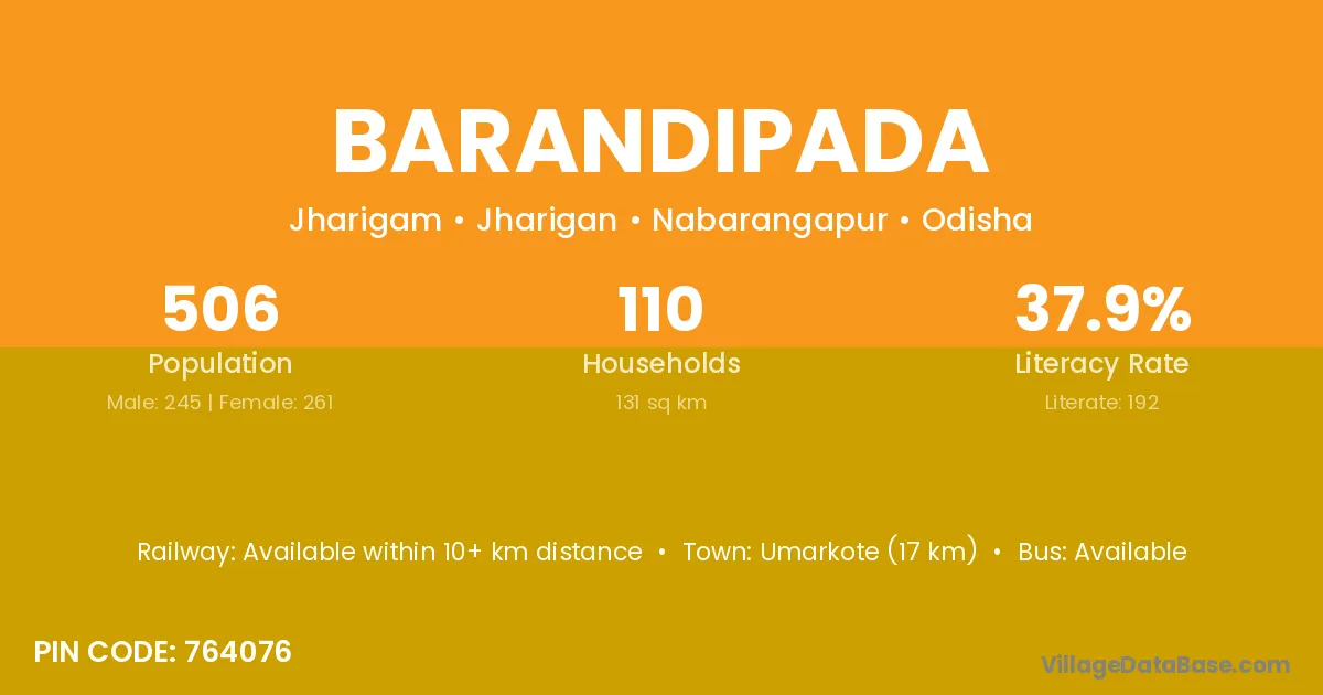 Umarkote (17 km) is the nearest town to Barandipada village for major economic activities and is located approximately 17 km away.
