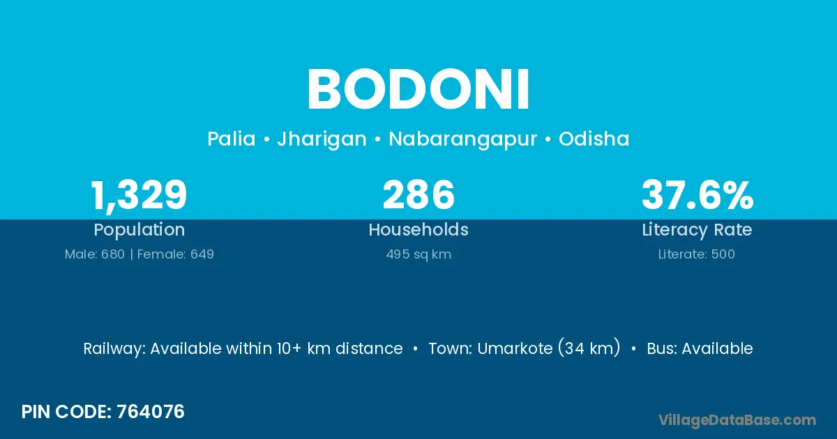 Umarkote (34 km) is the nearest town to Bodoni village for major economic activities and is located approximately 34 km away.
