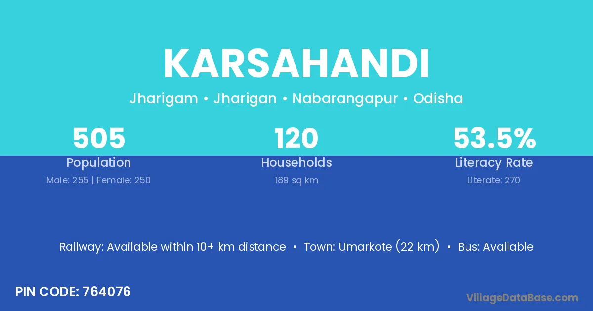 Karsahandi village has a total population of 505 people, of which 255 are males and 250 are females.