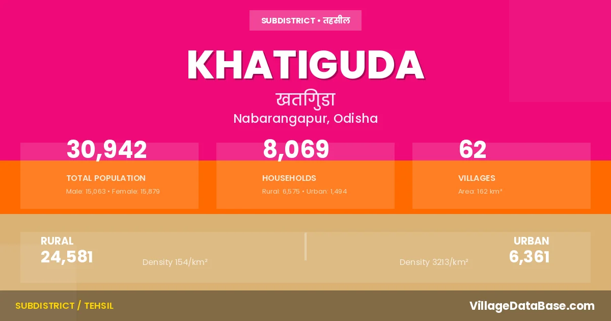 According to the 2011 census The total area of Khatiguda Tehsil is 162 km², with a population of 30942 people. The population density is 191 inhabitants per square kilometre, and there are approximately 8069 houses in the sub district.