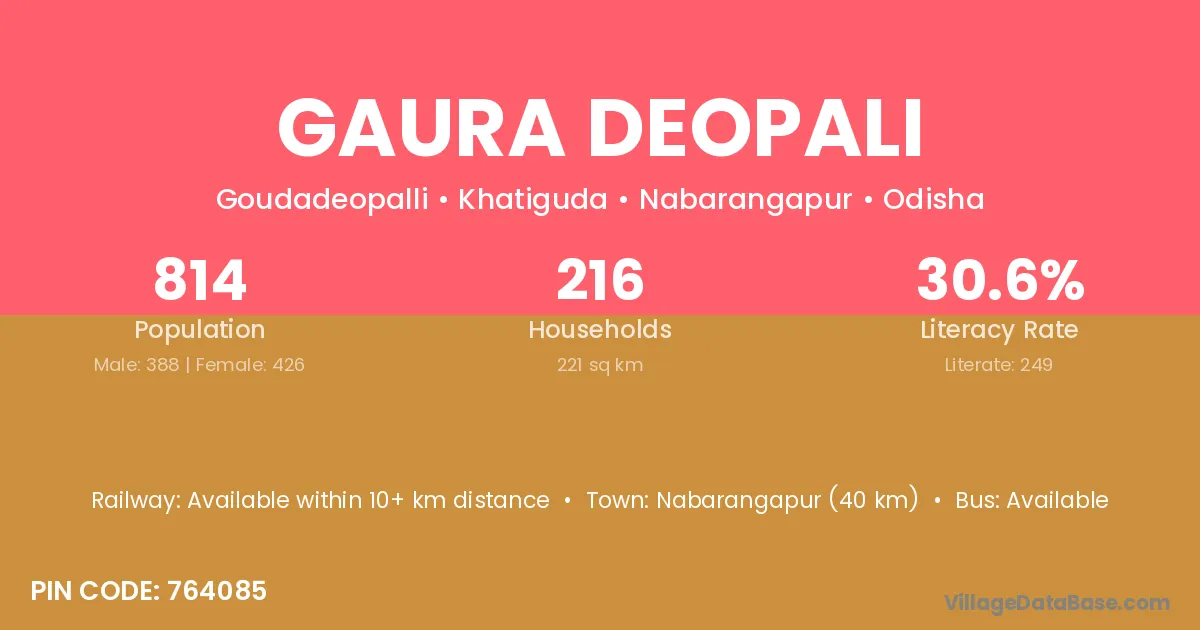 Nabarangapur (40 km) is the nearest town to Gaura Deopali village for major economic activities and is located approximately 40 km away.