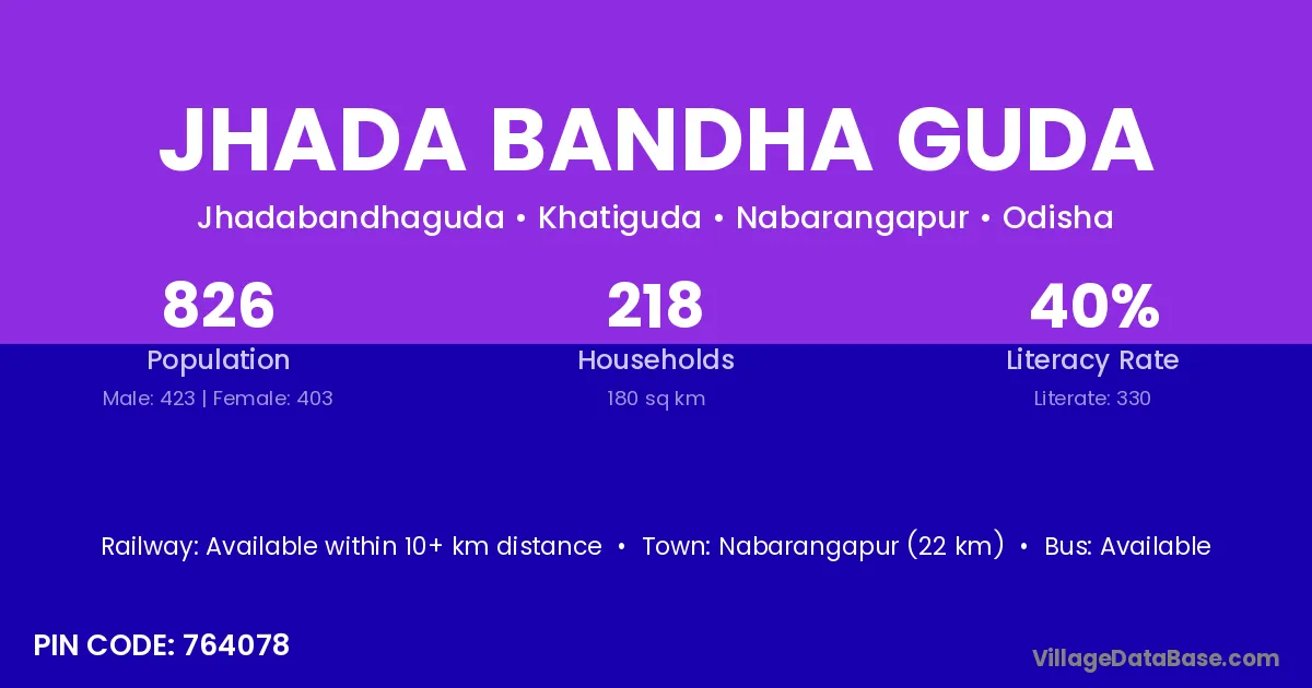 Nabarangapur (22 km) is the nearest town to Jhada Bandha Guda village for major economic activities and is located approximately 22 km away.