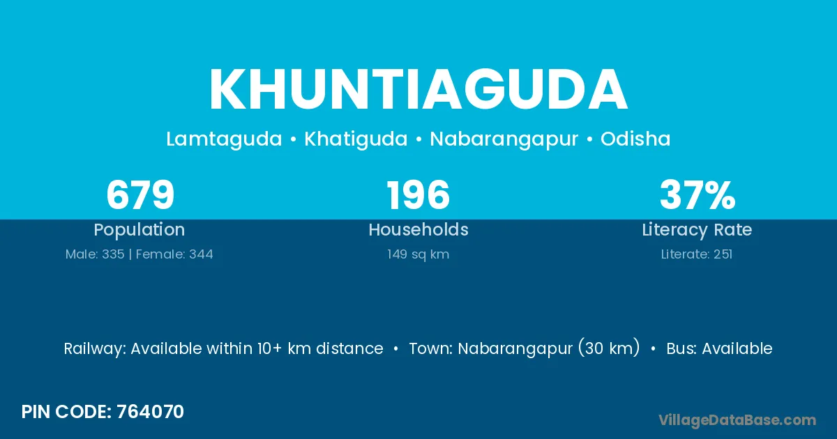 Nabarangapur (30 km) is the nearest town to Khuntiaguda village for major economic activities and is located approximately 30 km away.