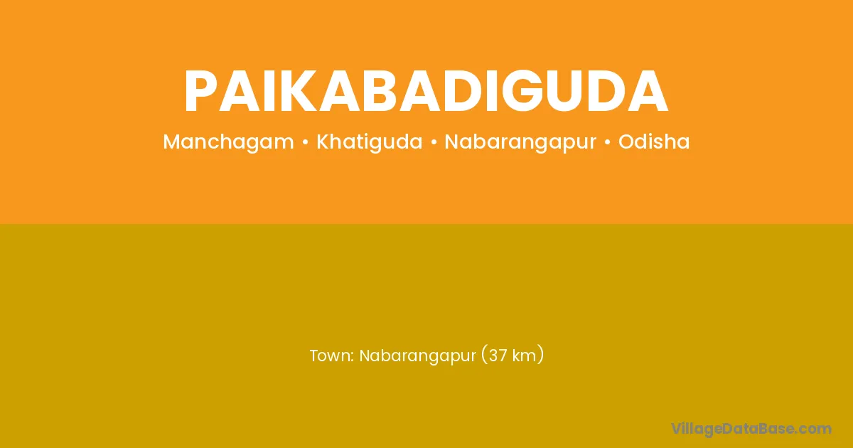 Nabarangapur (37 km) is the nearest town to Paikabadiguda village for major economic activities and is located approximately 37 km away.