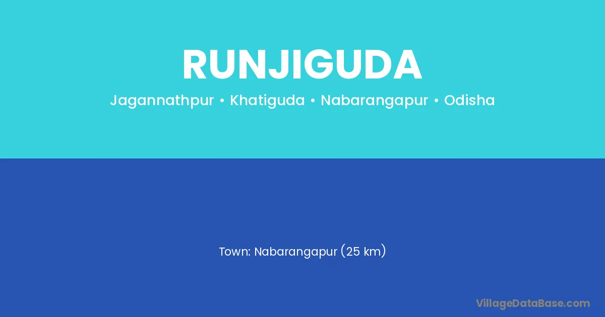 Nabarangapur (25 km) is the nearest town to Runjiguda village for major economic activities and is located approximately 25 km away.