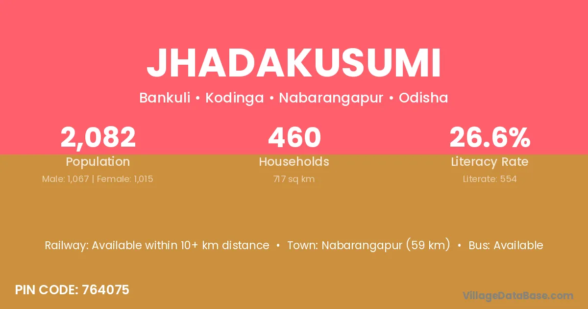 Nabarangapur (59 km) is the nearest town to Jhadakusumi village for major economic activities and is located approximately 59 km away.