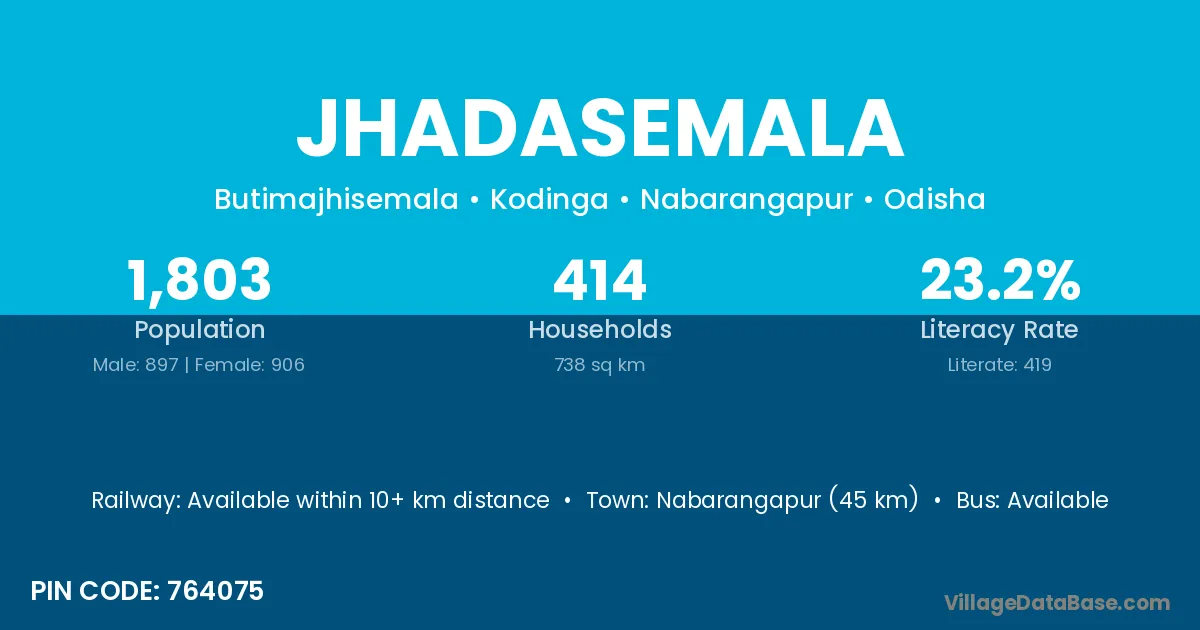 Nabarangapur (45 km) is the nearest town to Jhadasemala village for major economic activities and is located approximately 45 km away.