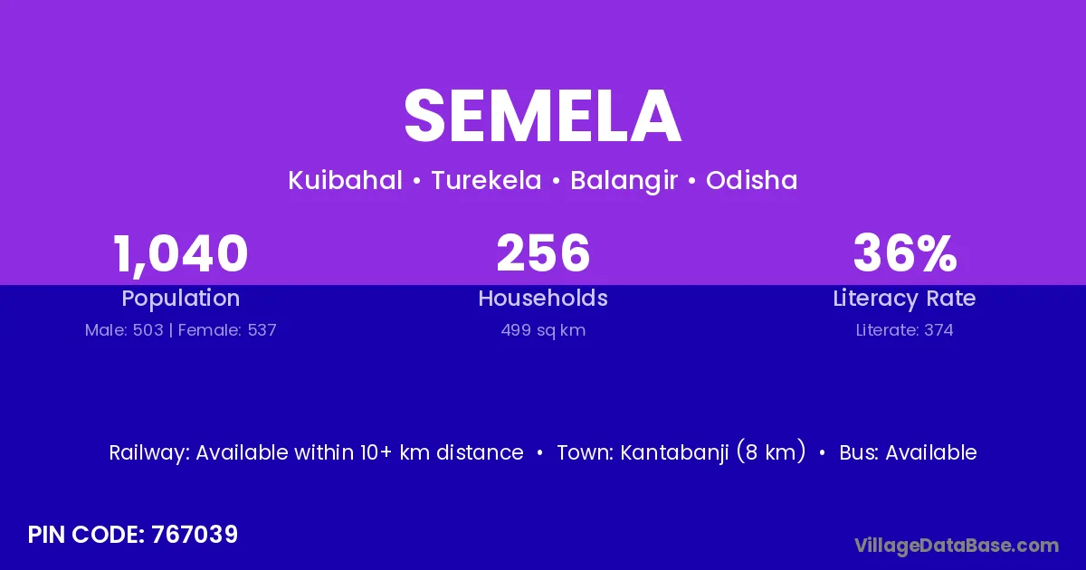 Nabarangapur (32 km) is the nearest town to Semela village for major economic activities and is located approximately 32 km away.