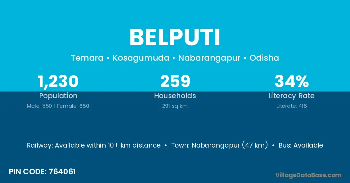 Nabarangapur (47 km) is the nearest town to Belputi village for major economic activities and is located approximately 47 km away.