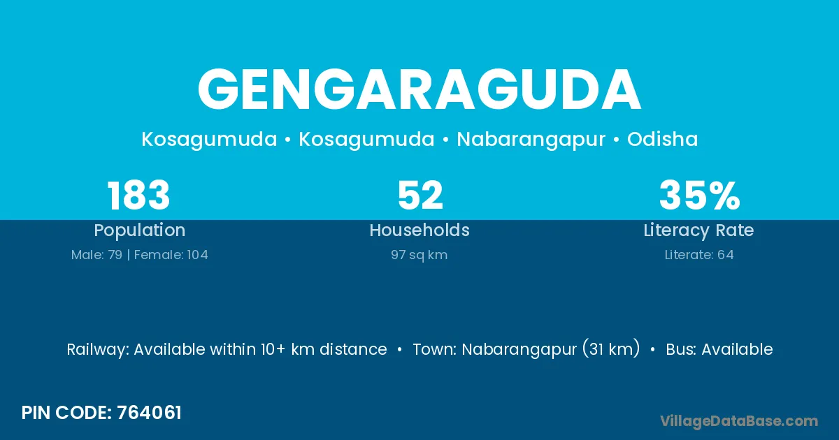 Nabarangapur (31 km) is the nearest town to Gengaraguda village for major economic activities and is located approximately 31 km away.
