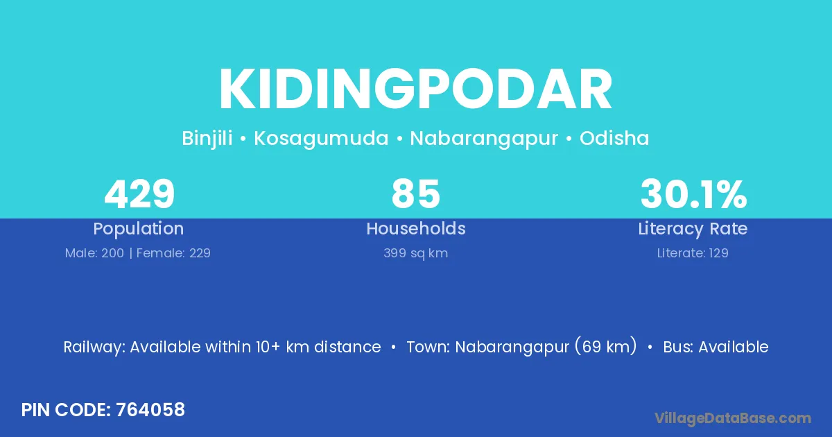 Nabarangapur (69 km) is the nearest town to Kidingpodar village for major economic activities and is located approximately 69 km away.