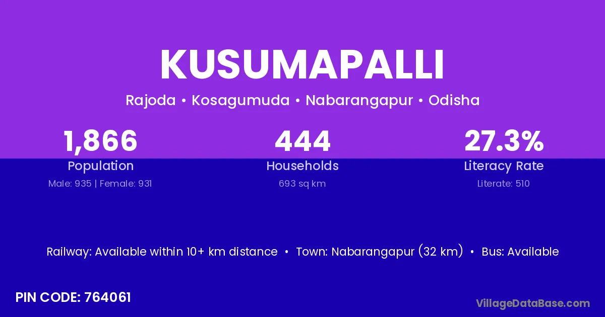 Nabarangapur (32 km) is the nearest town to Kusumapalli village for major economic activities and is located approximately 32 km away.