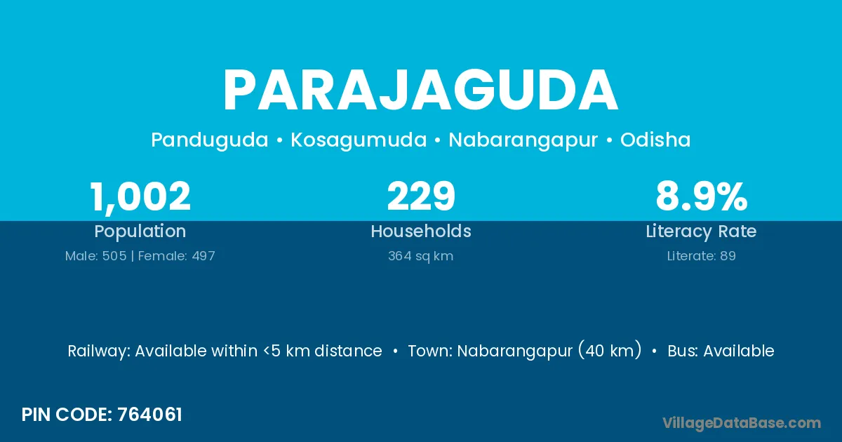Nabarangapur (40 km) is the nearest town to Parajaguda village for major economic activities and is located approximately 40 km away.
