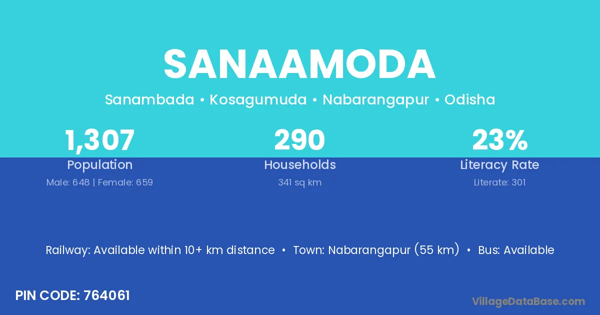 Nabarangapur (55 km) is the nearest town to Sanaamoda village for major economic activities and is located approximately 55 km away.