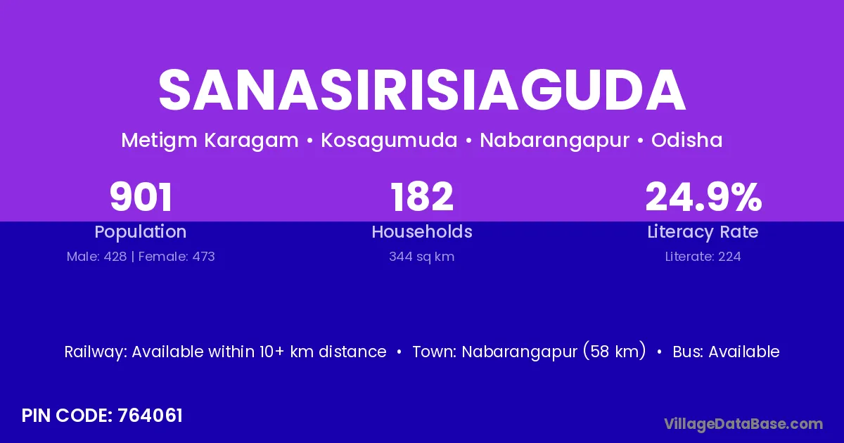 Nabarangapur (58 km) is the nearest town to Sanasirisiaguda village for major economic activities and is located approximately 58 km away.