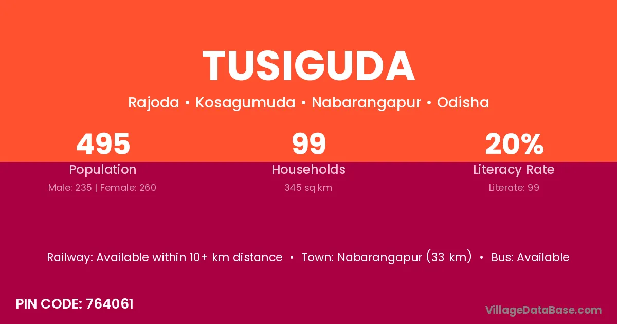 Nabarangapur (33 km) is the nearest town to Tusiguda village for major economic activities and is located approximately 33 km away.