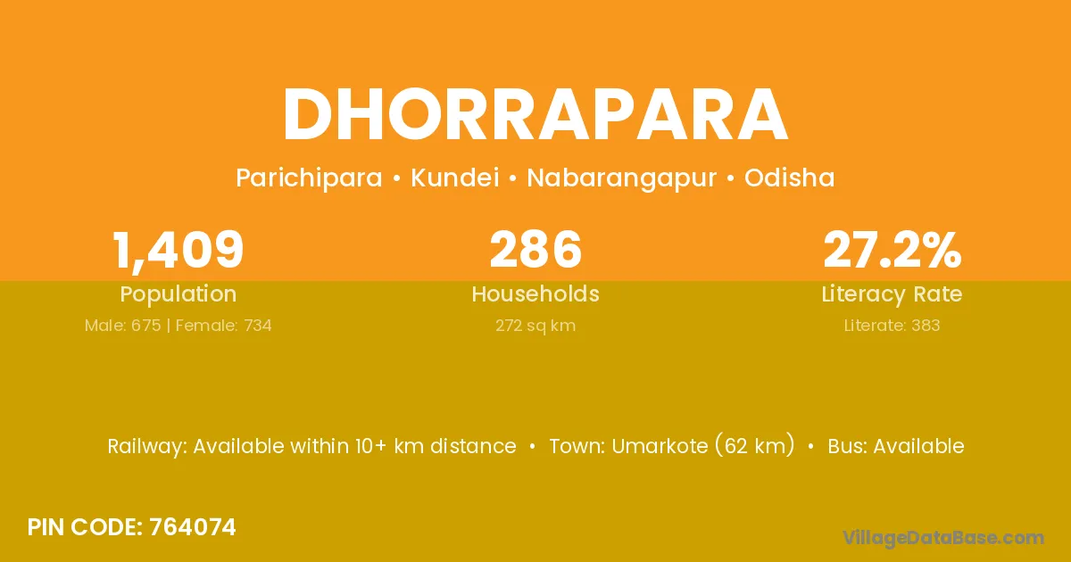 Umarkote (62 km) is the nearest town to Dhorrapara village for major economic activities and is located approximately 62 km away.