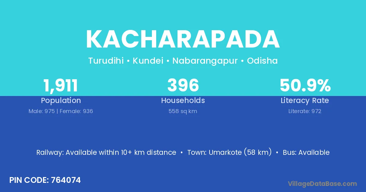 Umarkote (58 km) is the nearest town to Kacharapada village for major economic activities and is located approximately 58 km away.