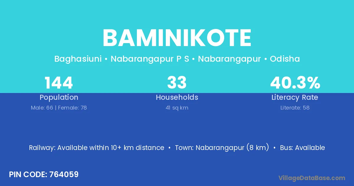 Nabarangapur (8 km) is the nearest town to Baminikote village for major economic activities and is located approximately 8 km away.