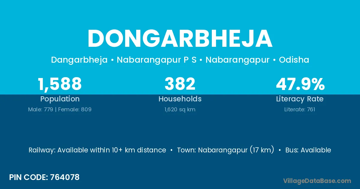 Nabarangapur (17 km) is the nearest town to Dongarbheja village for major economic activities and is located approximately 17 km away.