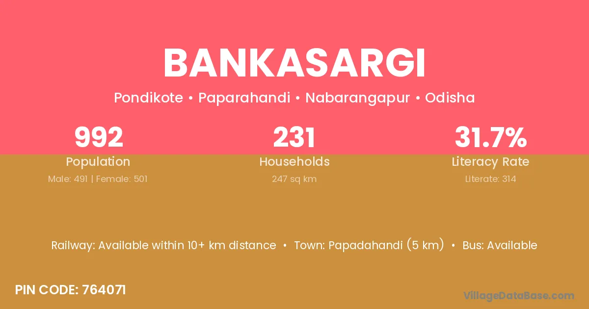 Papadahandi (5 km) is the nearest town to Bankasargi village for major economic activities and is located approximately 5 km away.