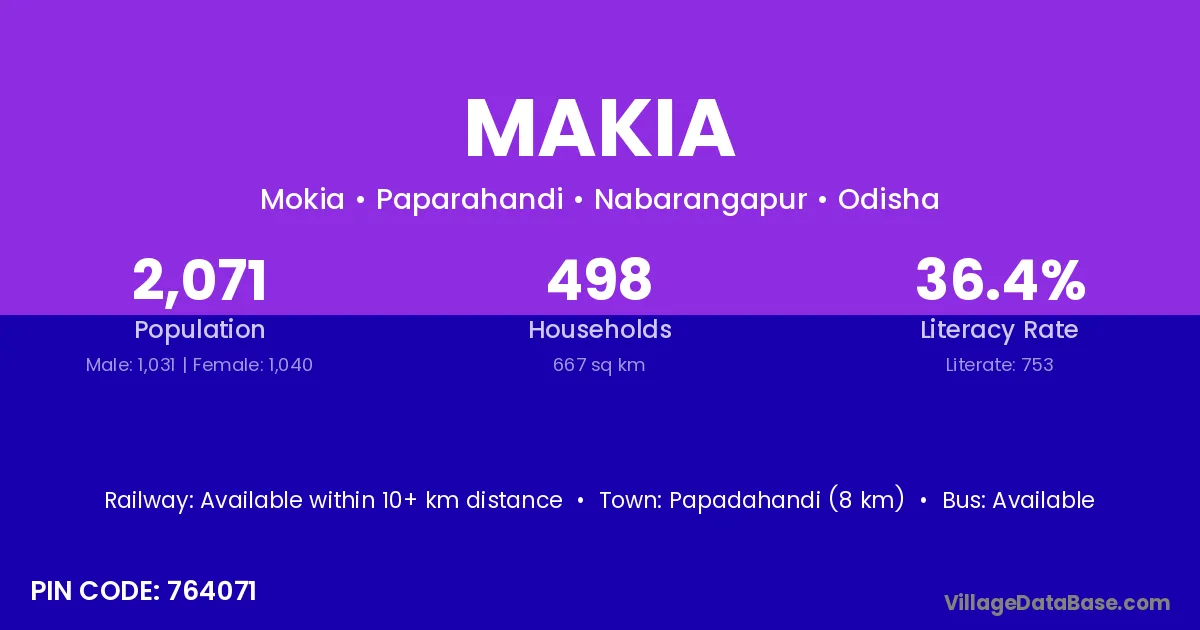 Papadahandi (8 km) is the nearest town to Makia village for major economic activities and is located approximately 8 km away.