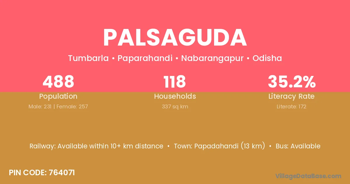 Papadahandi (13 km) is the nearest town to Palsaguda village for major economic activities and is located approximately 13 km away.