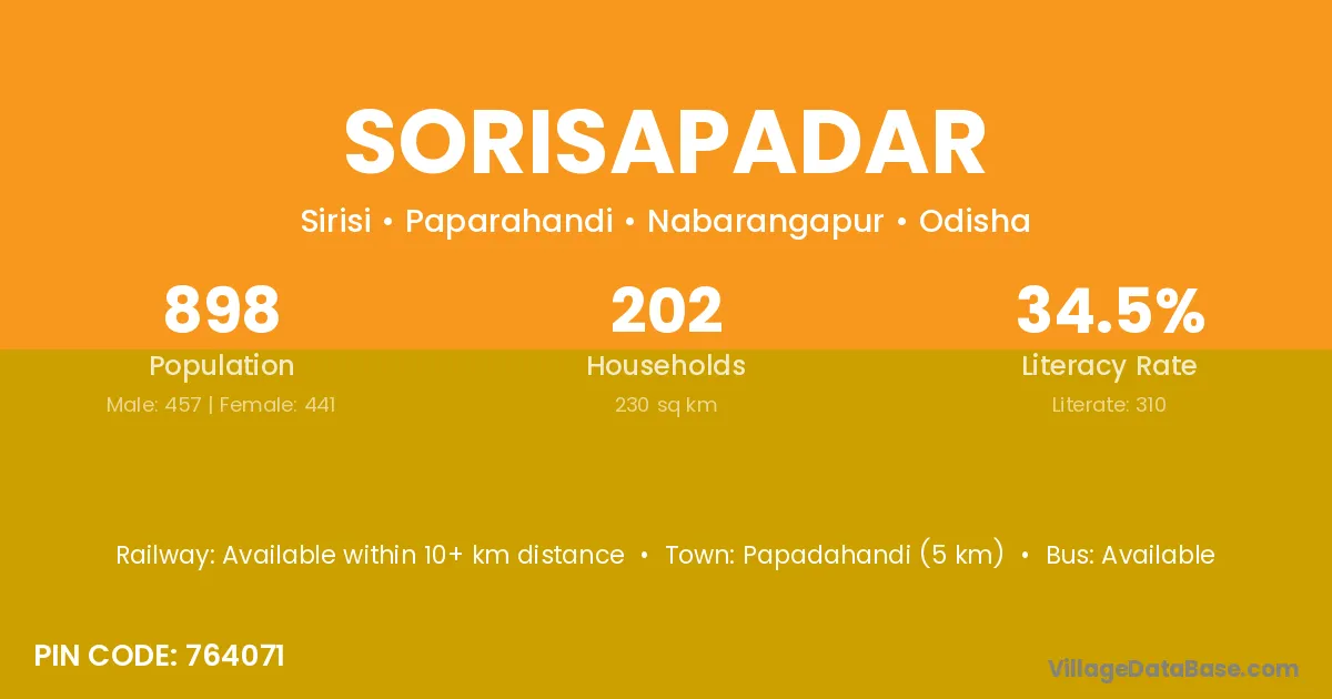 Papadahandi (5 km) is the nearest town to Sorisapadar village for major economic activities and is located approximately 5 km away.
