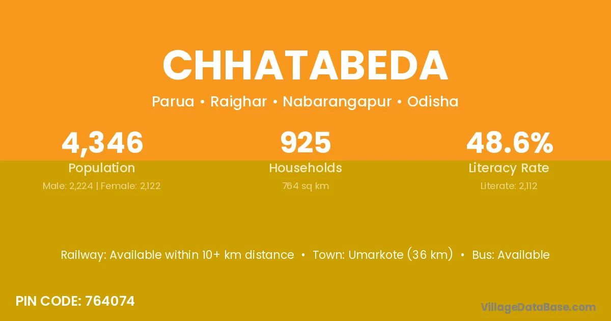 According to Census 2011 information, the village code of Chhatabeda village is 764074.