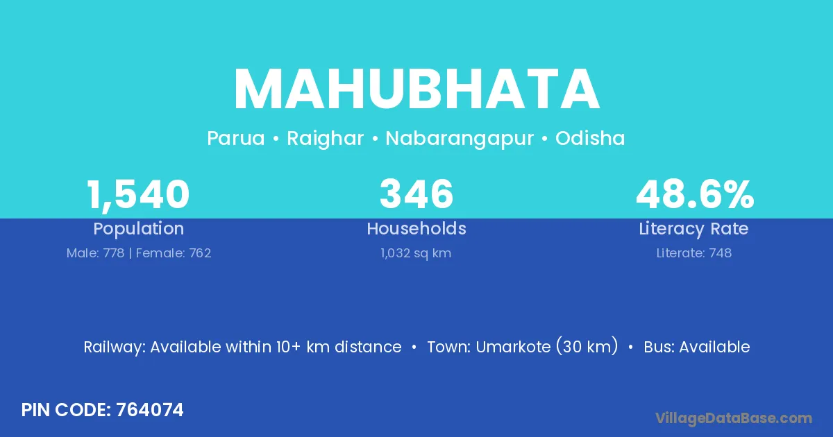 Umarkote (30 km) is the nearest town to Mahubhata village for major economic activities and is located approximately 30 km away.