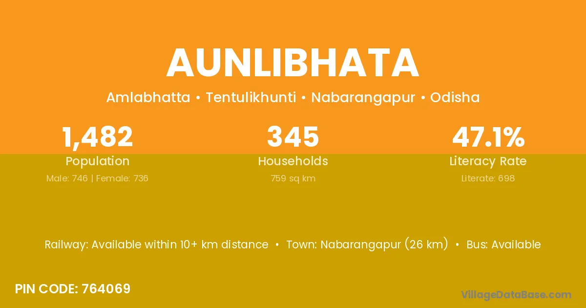 Nabarangapur (26 km) is the nearest town to Aunlibhata village for major economic activities and is located approximately 26 km away.