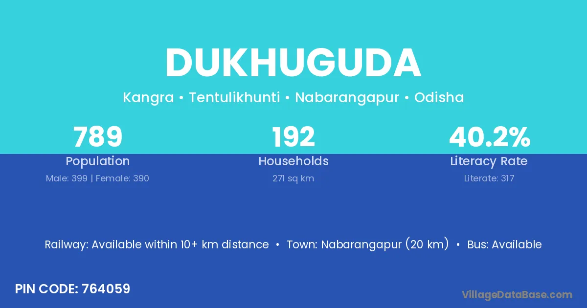 Nabarangapur (20 km) is the nearest town to Dukhuguda village for major economic activities and is located approximately 20 km away.