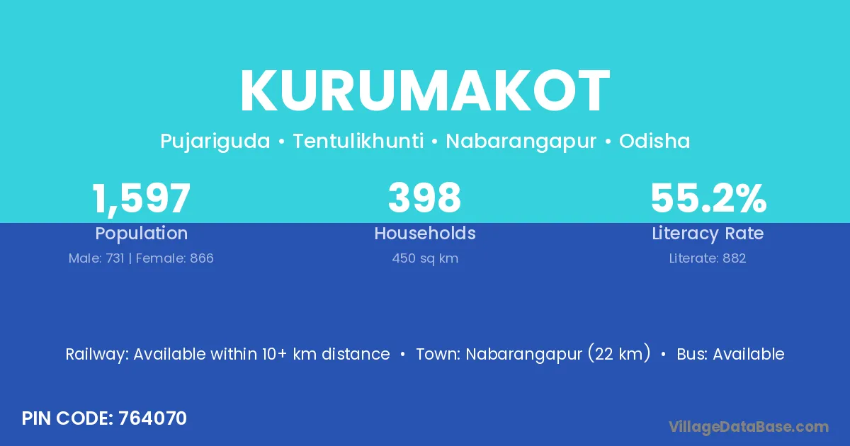 Nabarangapur (22 km) is the nearest town to Kurumakot village for major economic activities and is located approximately 22 km away.