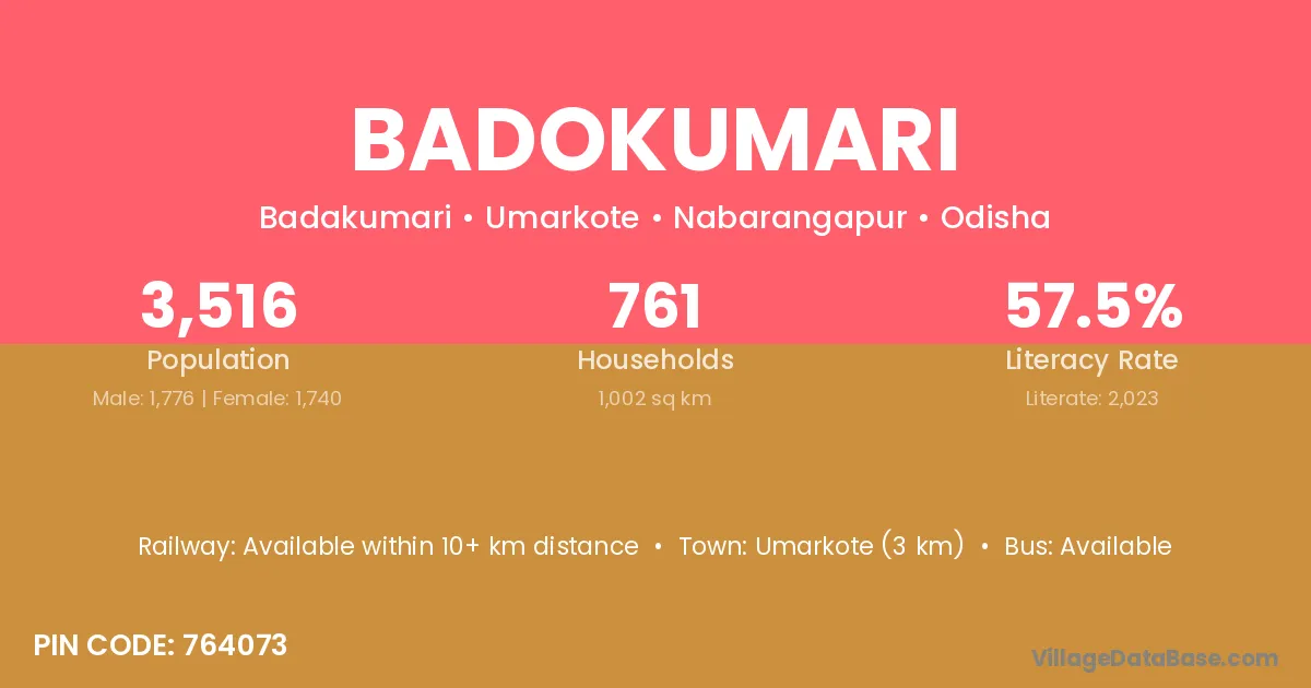 Umarkote (3 km) is the nearest town to Badokumari village for major economic activities and is located approximately 3 km away.
