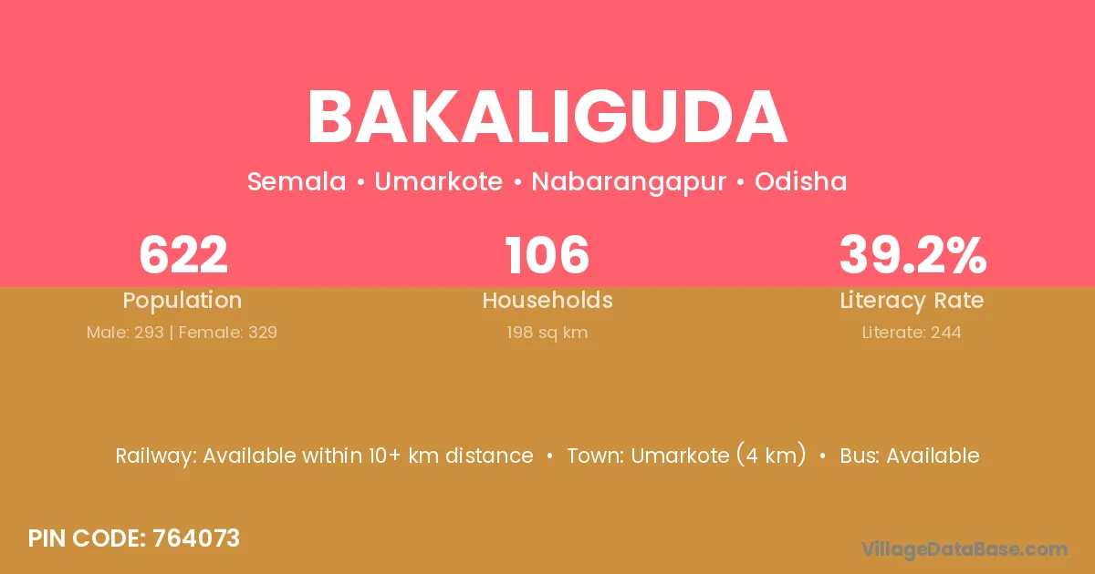 Umarkote (4 km) is the nearest town to Bakaliguda village for major economic activities and is located approximately 4 km away.