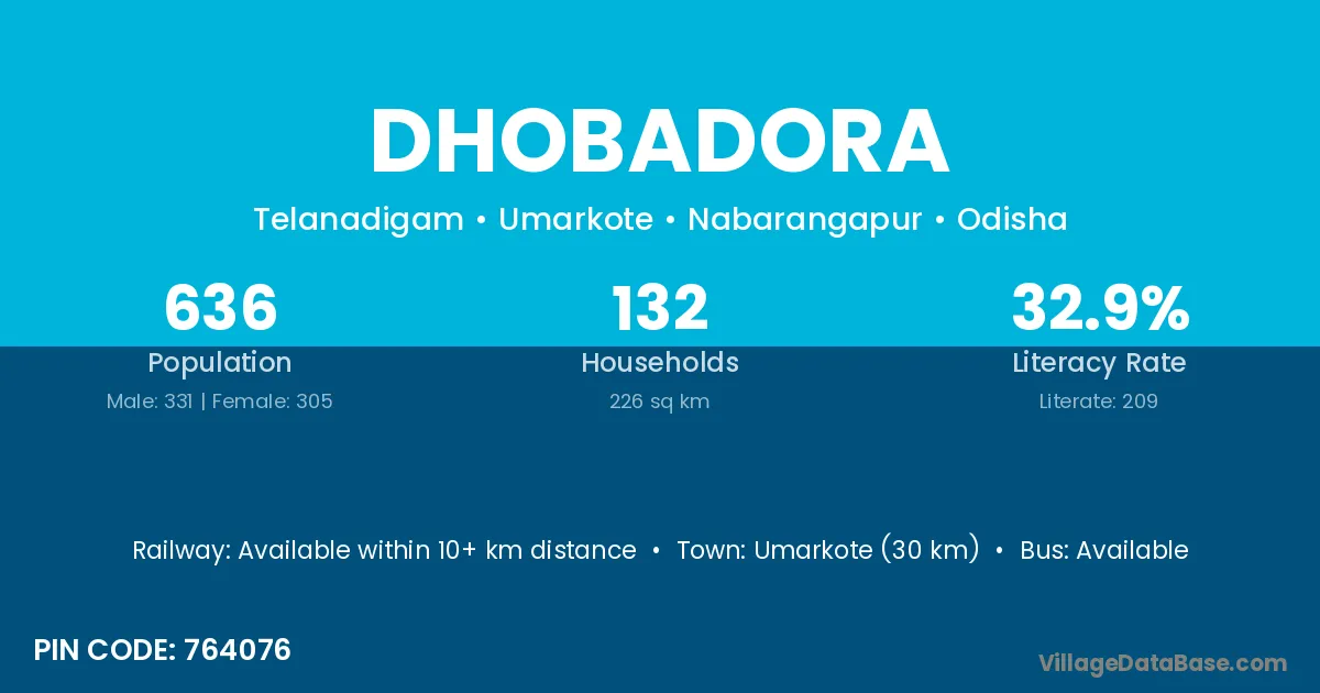 Umarkote (30 km) is the nearest town to Dhobadora village for major economic activities and is located approximately 30 km away.