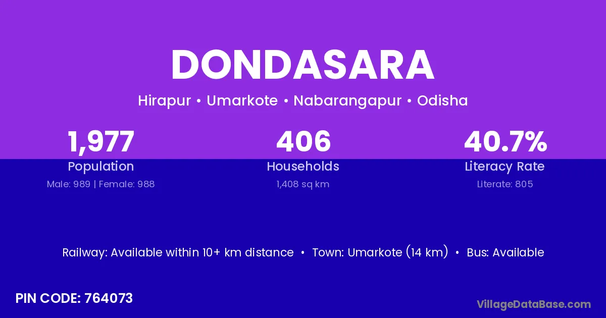 Umarkote (14 km) is the nearest town to Dondasara village for major economic activities and is located approximately 14 km away.