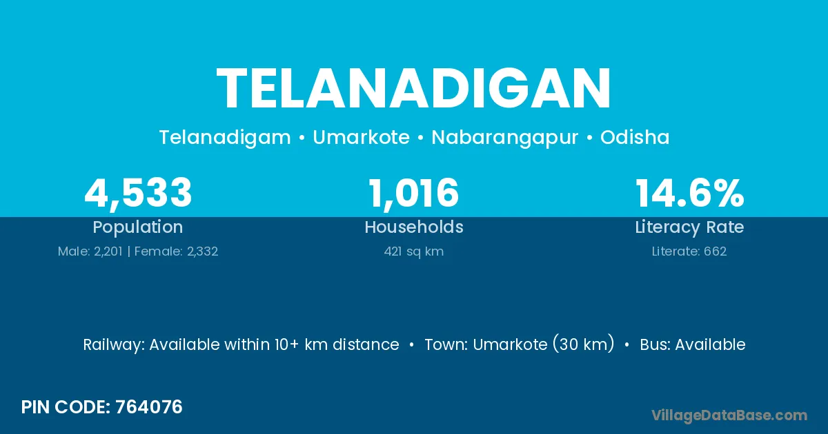 Umarkote (30 km) is the nearest town to Telanadigan village for major economic activities and is located approximately 30 km away.