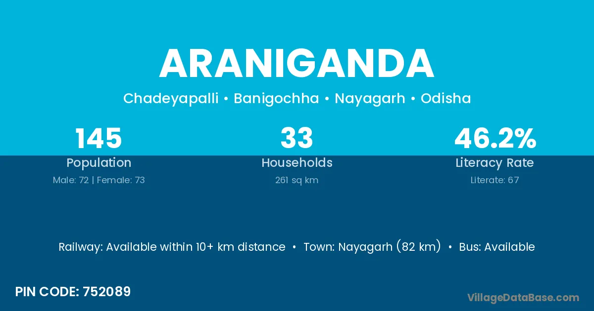 Nayagarh (82 km) is the nearest town to Araniganda village for major economic activities and is located approximately 82 km away.