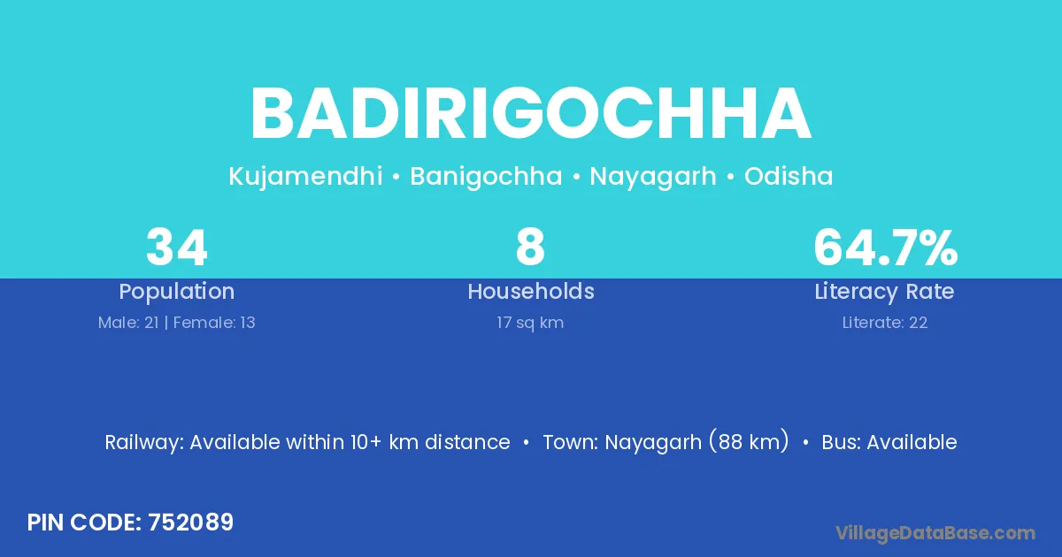 Nayagarh (88 km) is the nearest town to Badirigochha village for major economic activities and is located approximately 88 km away.
