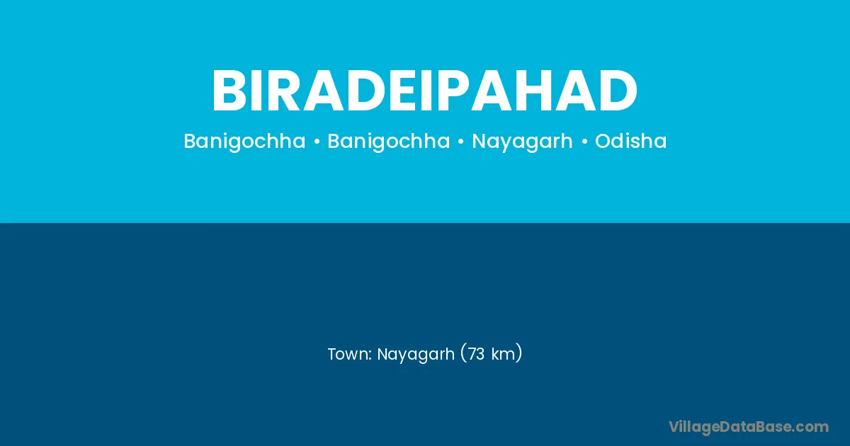 Nayagarh (73 km) is the nearest town to Biradeipahad village for major economic activities and is located approximately 73 km away.
