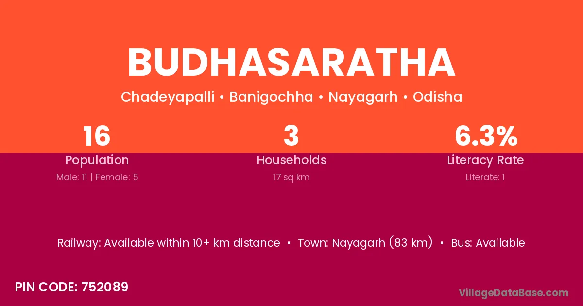 Budhasaratha village has a total population of 16 people, of which 11 are males and 5 are females.