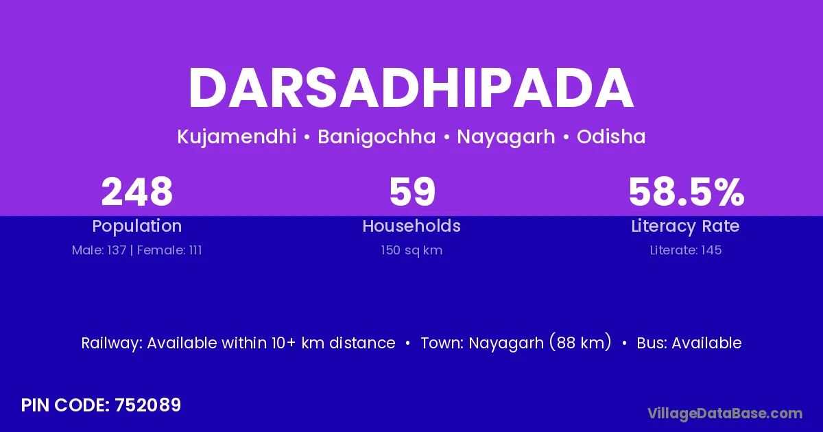 Nayagarh (88 km) is the nearest town to Darsadhipada village for major economic activities and is located approximately 88 km away.