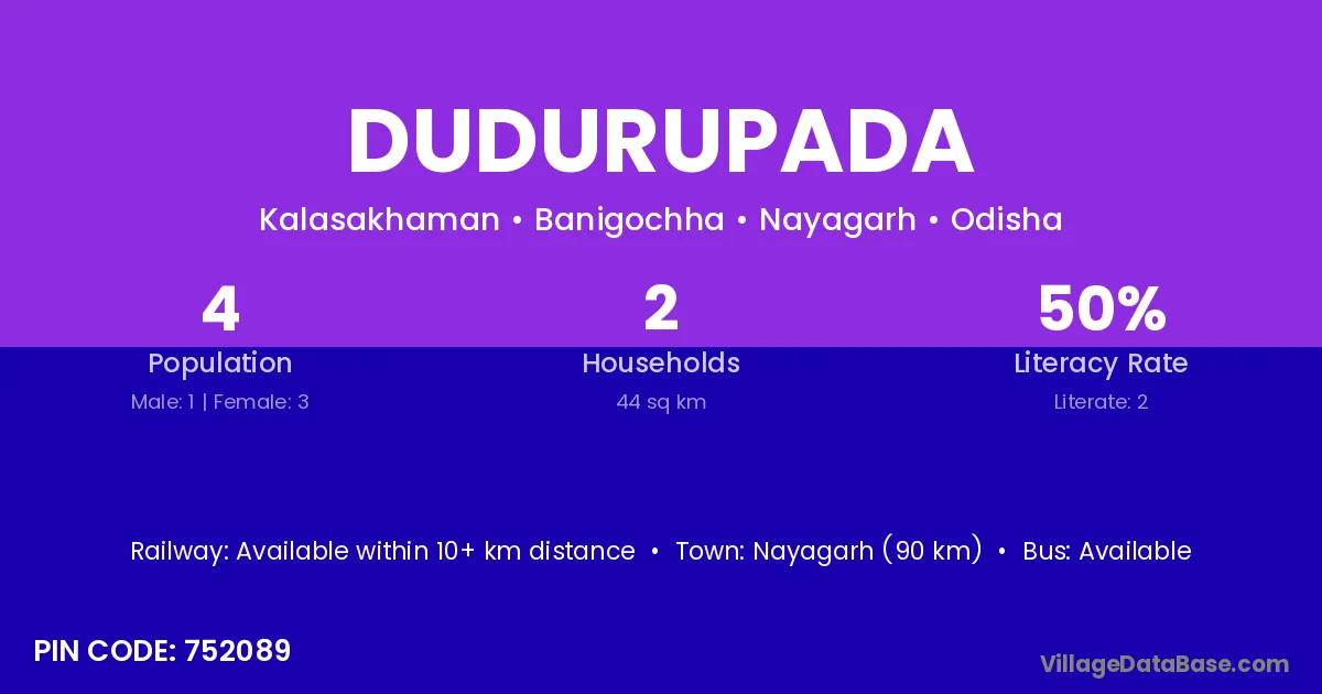 Nayagarh (90 km) is the nearest town to Dudurupada village for major economic activities and is located approximately 90 km away.