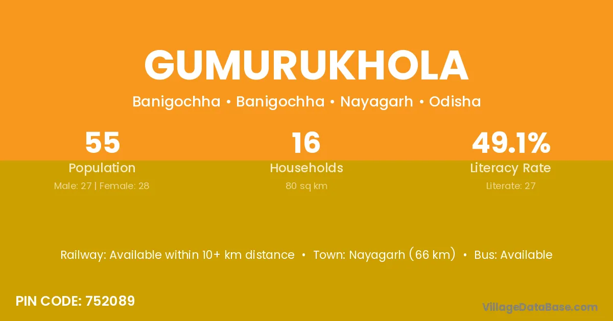 Nayagarh (66 km) is the nearest town to Gumurukhola village for major economic activities and is located approximately 66 km away.