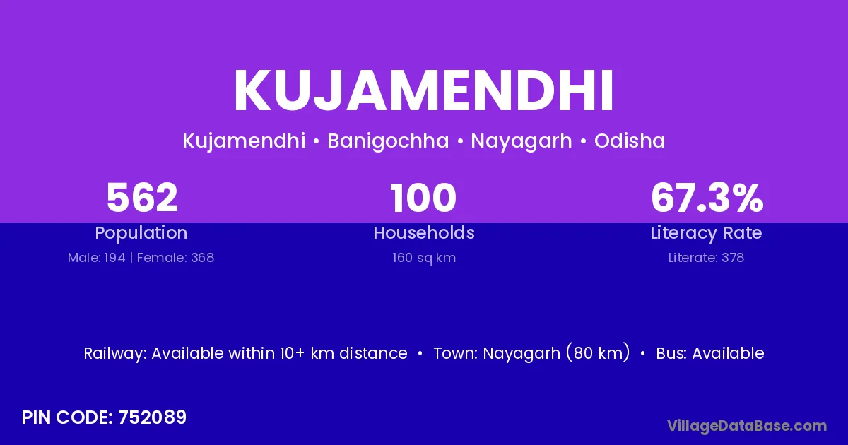 Nayagarh (80 km) is the nearest town to Kujamendhi village for major economic activities and is located approximately 80 km away.