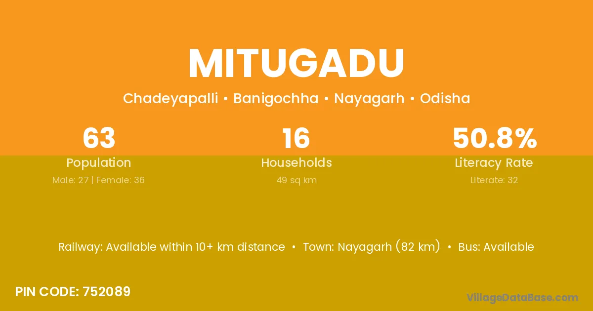 Nayagarh (82 km) is the nearest town to Mitugadu village for major economic activities and is located approximately 82 km away.