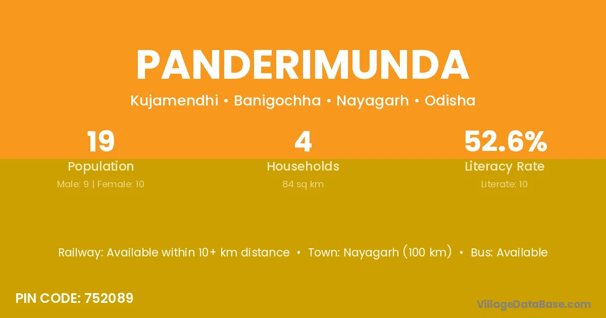 Panderimunda village has a total population of 19 people, of which 9 are males and 10 are females.