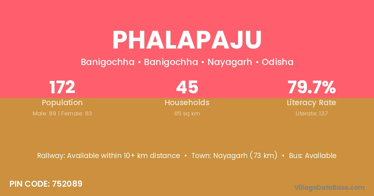 Nayagarh (73 km) is the nearest town to Phalapaju village for major economic activities and is located approximately 73 km away.