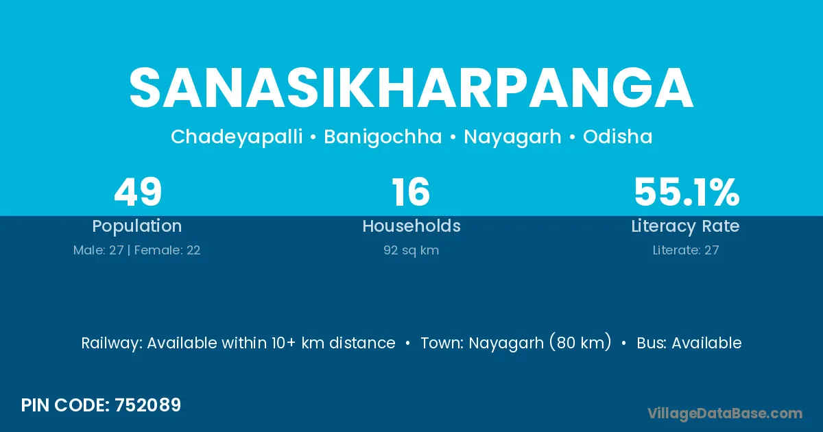 Nayagarh (80 km) is the nearest town to Sanasikharpanga village for major economic activities and is located approximately 80 km away.